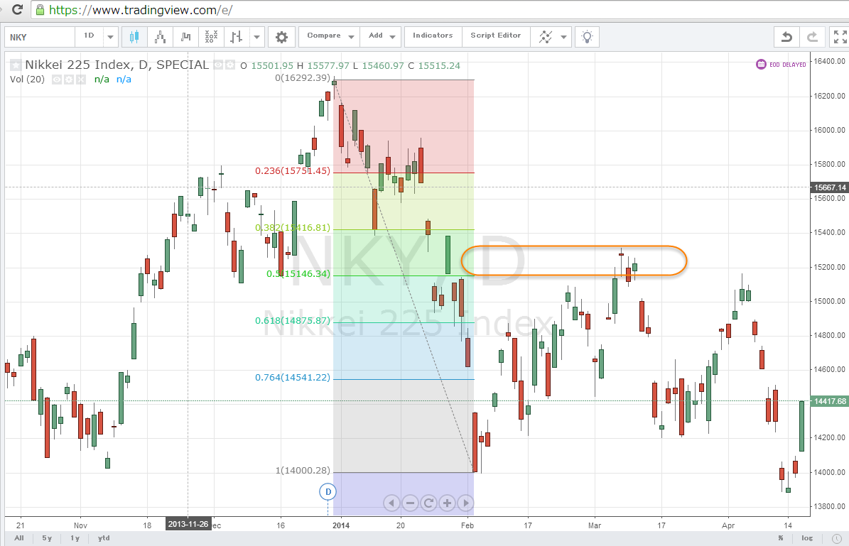代表的なチャートの事例に、テクニカルで必ず使われるフィボナッチ・レベルを載せて見ていってみましょう。[/text_block]