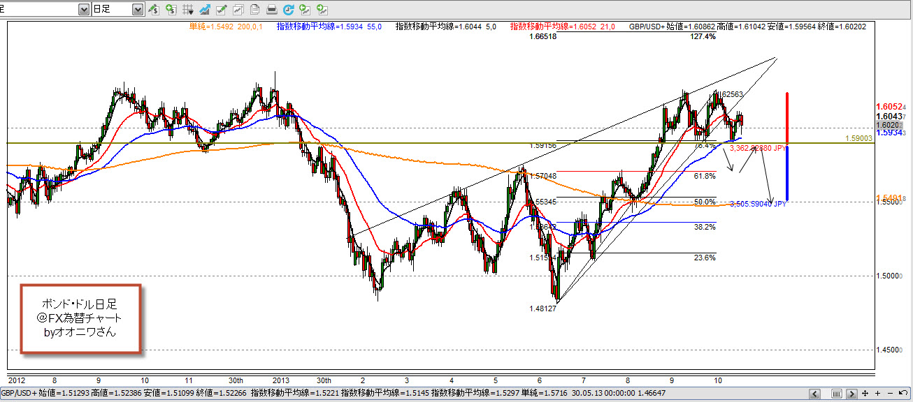 ③ 最後の日足ですが、ダブルトップのような、形になっています。もし、1.5900あたりをブレイクした場合、61.8%(1.5700付近)をヒットし、今度は、ネックラインの戻しをまち、1.5900付近のロウソクの反転形状をみて、エントリーすれば、良いのではないかと思いました。ダブルトップの目標値は、赤のラインの幅だけ下落ですから、ちょうど50%あたりになるのではないかなと思います。