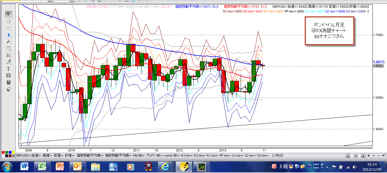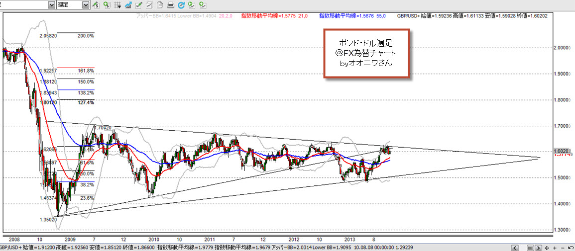 ② 週足では、以前引いていた、トレンドㇾラインではなく、新たなトレンドラインを引いてみました。これだけでみると、ポンドドルは、まだ、トライアングルの中にいるのではないかと思います。だとすると、長期的には、下方のトレンドラインを目指すのではないかなと思います。