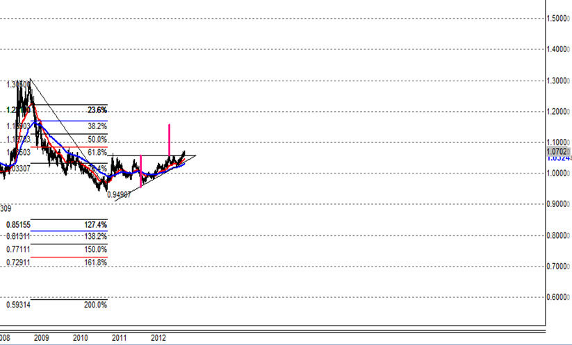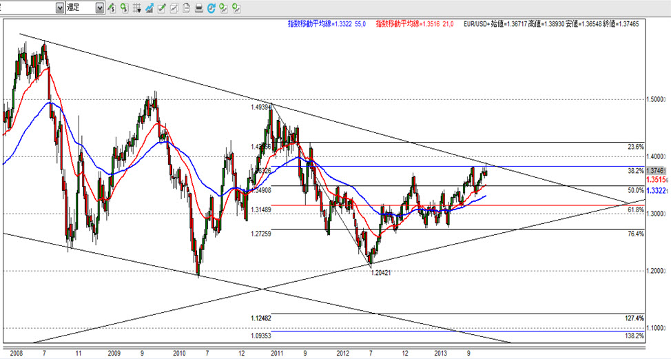 ① ユーロドルの週足が、見事、38.2%戻しで跳ね返されました。