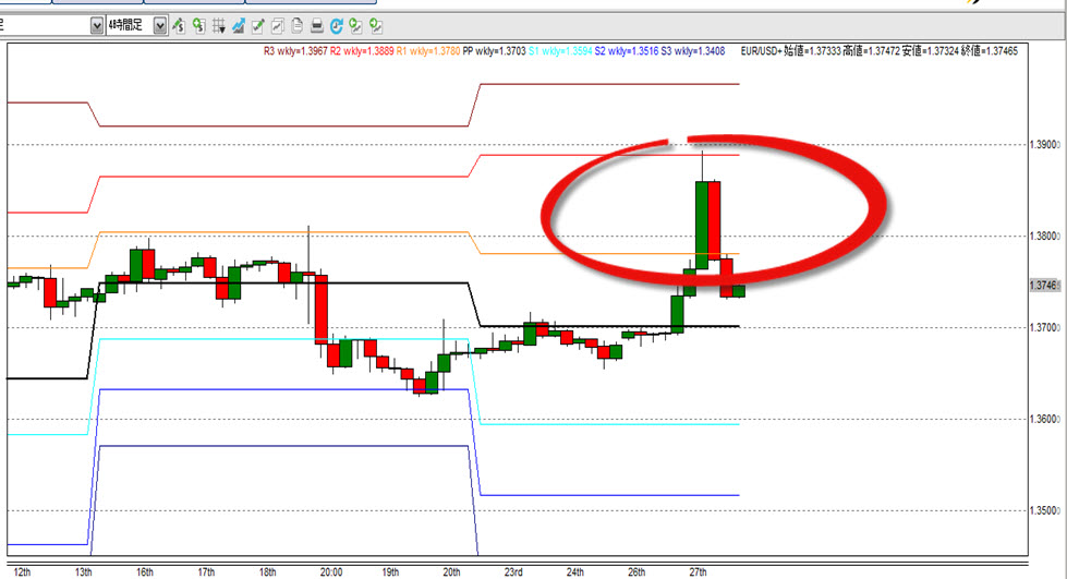 ダブルトップ様になっています ② 日足では、ロウソクの実体が、1.38にいることを許してもらえ
