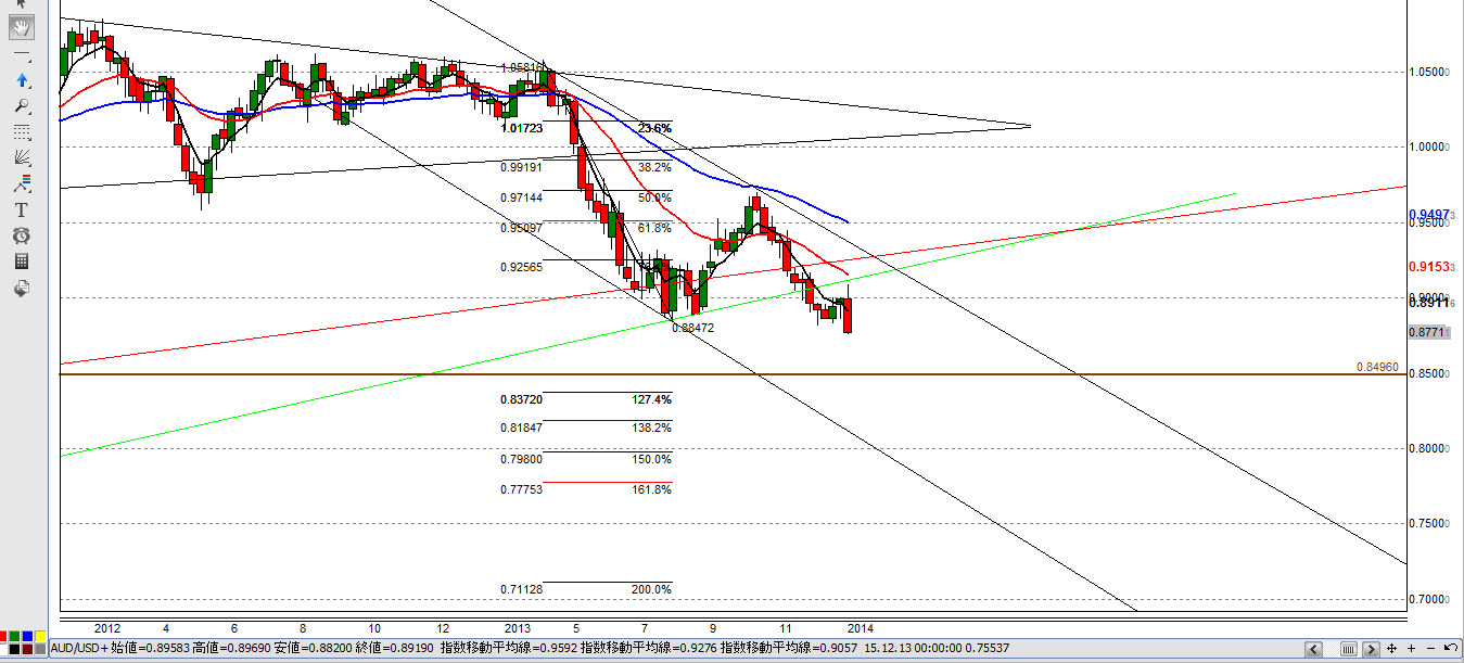 売りポディションはホールド中です。本来ならば、報酬比率3倍で利食いですが、今回は、いくところまで、行くと思うのでこのままホールです。ターゲットは、日足のチャネルラインの下限0.86付近とマンスリーピボットサポート2です。ここまできたら、利食います。そしてここで、サポートされて、上がってきたら、再び売りポディション構築し、下に突き抜ければ、機会損失です。