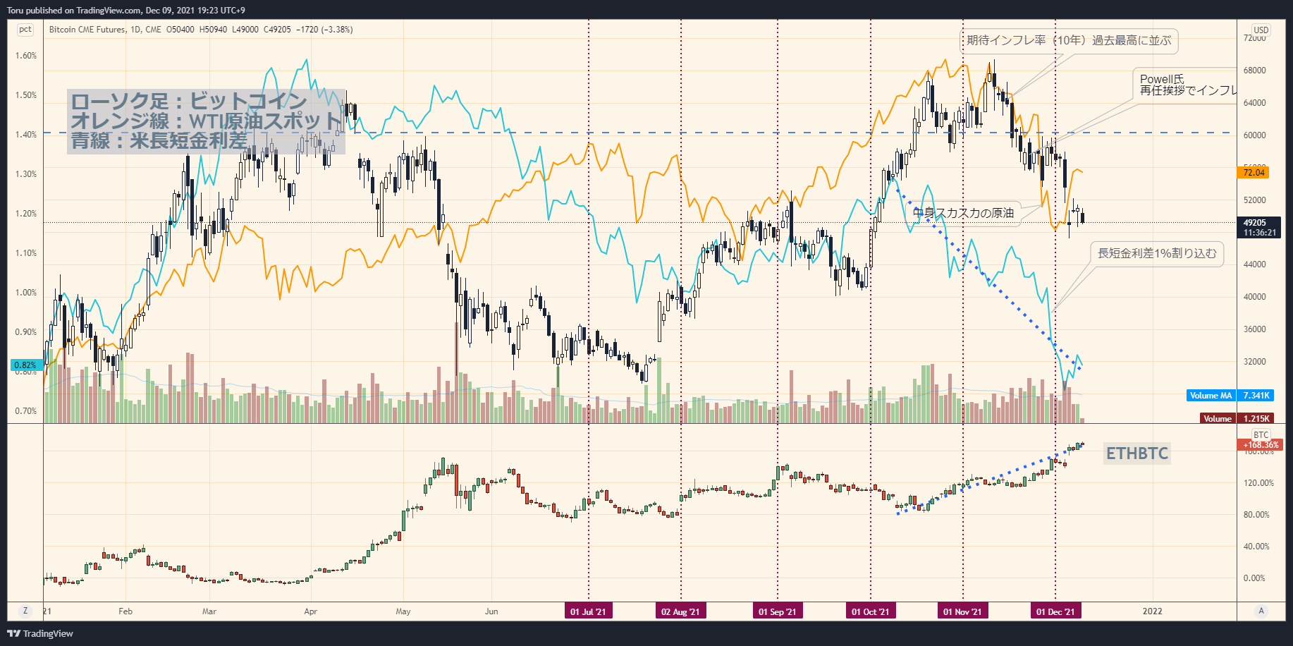 2021年11月15日に米10年物の期待インフレ率(ブレークイーブンインフレ)が過去最高値に並ぶ → 市場はインフレ資産の利確に動く。ここからビットコインは急速に上昇圧力を失う。
