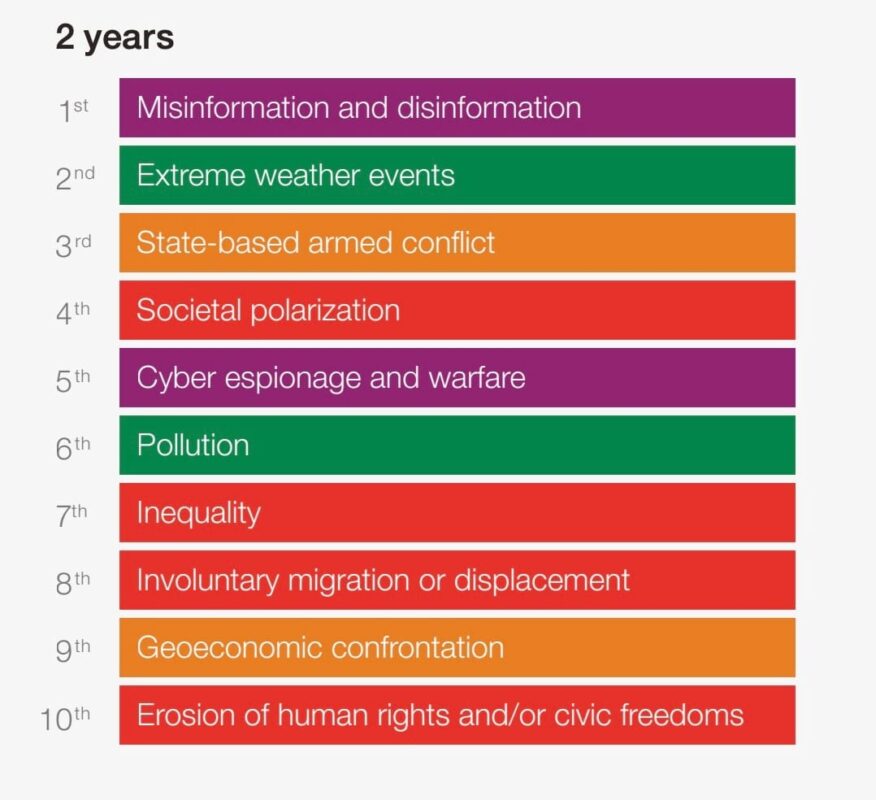 World Economic ForumのGlobal Risks Report 2025から、今後2年間の短期スパンで最も深刻なリスクとして挙げられている項目の1位は、「生成AIによる偽動画・誤報の拡大」です。
