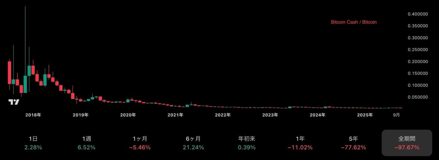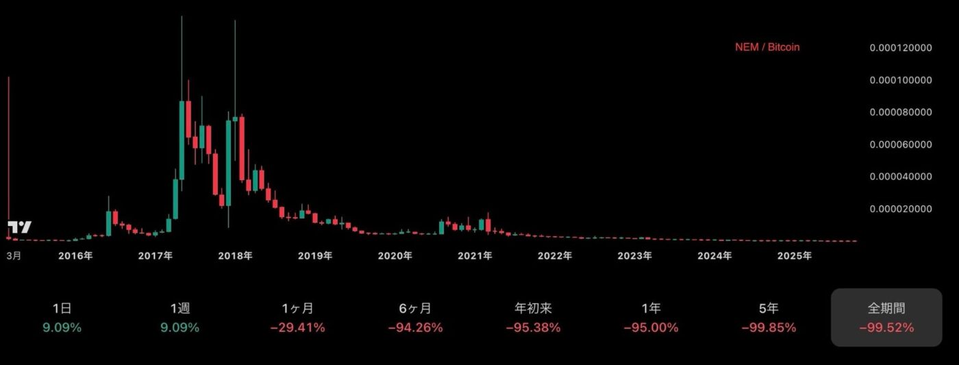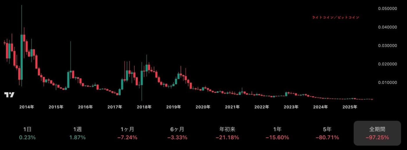 多くのアルトコインは数年単位で見ると、ビットコインに対して、ほとんどの価値を失っています。