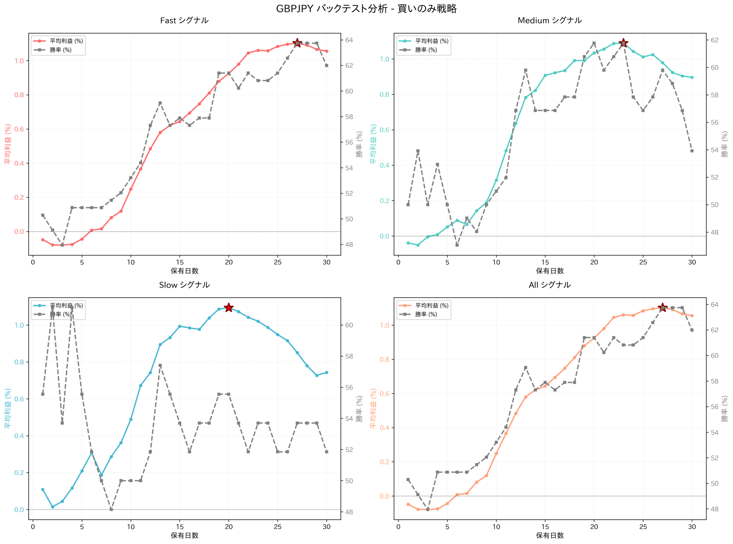 よくあるアドバイスに「早めの利確が大事」というものがあります。確かに、それが正解の場面もあります。でも、GBPJPYの買い戦略では、むしろ「じっくり持つ」方が合理的だとデータが教えてくれました。