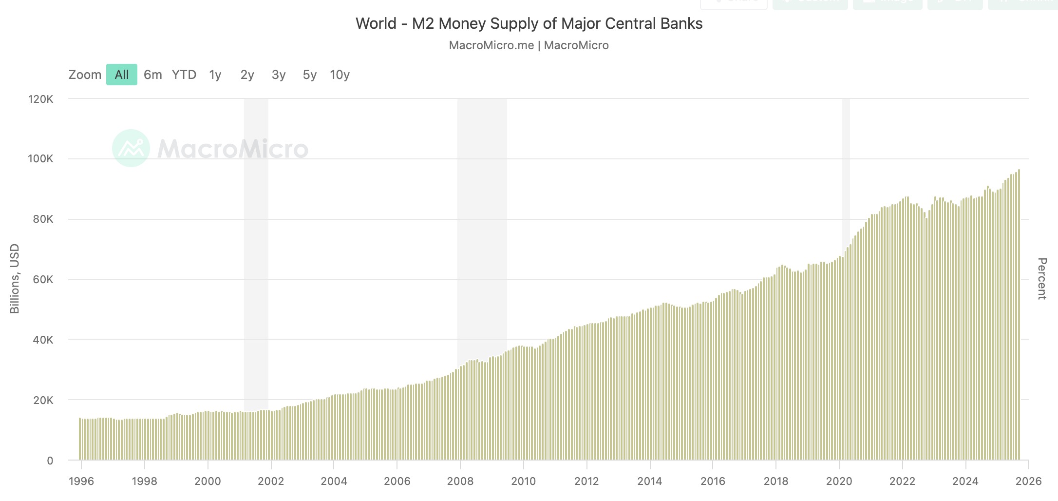 ▲ 世界の主要中央銀行のM2マネーサプライ推移(継続的に増加している)