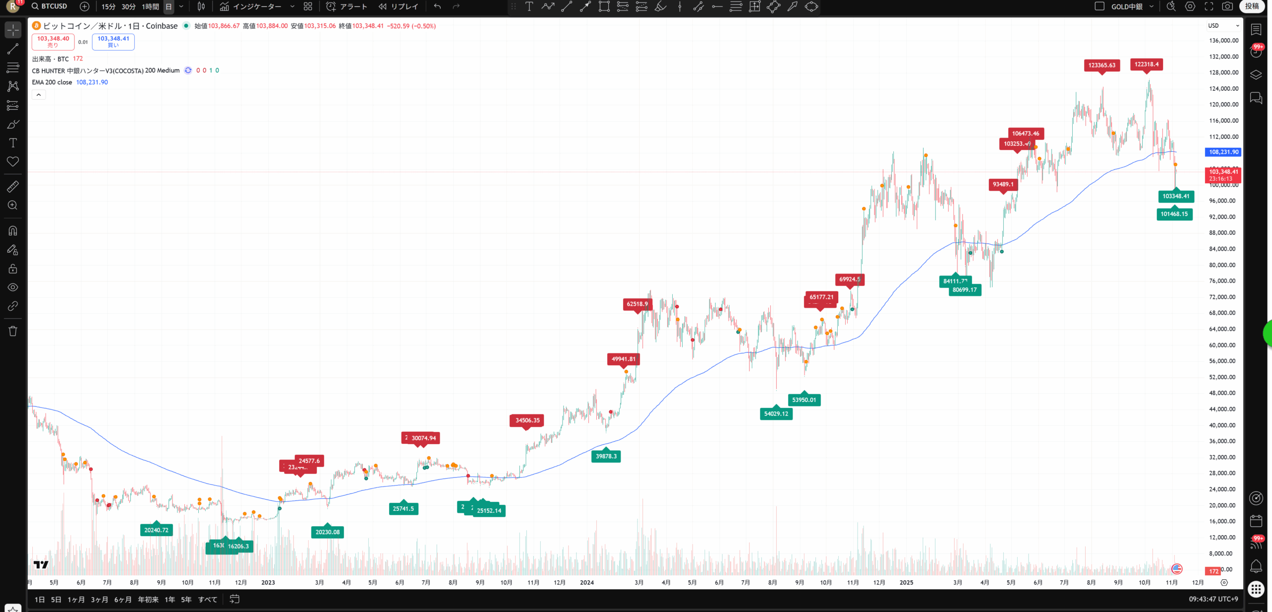TradingViewに呼び出すだけで、自動で買い場の目安を示してくれます。