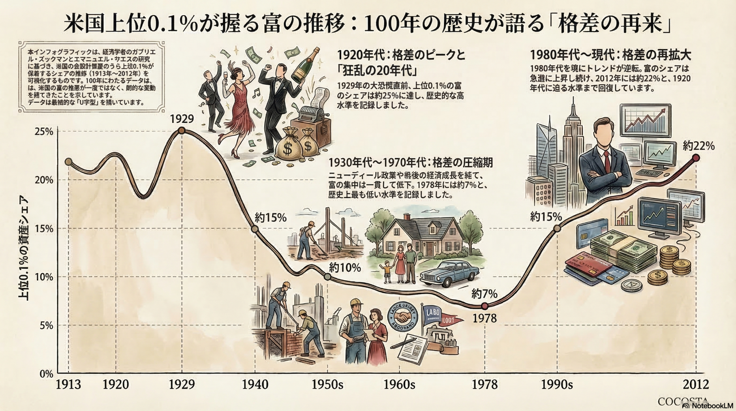 上位0.1%が持つ資産シェアは、1929年前後に約25%のピークを記録しました。「グレート・ギャツビー」の時代です。