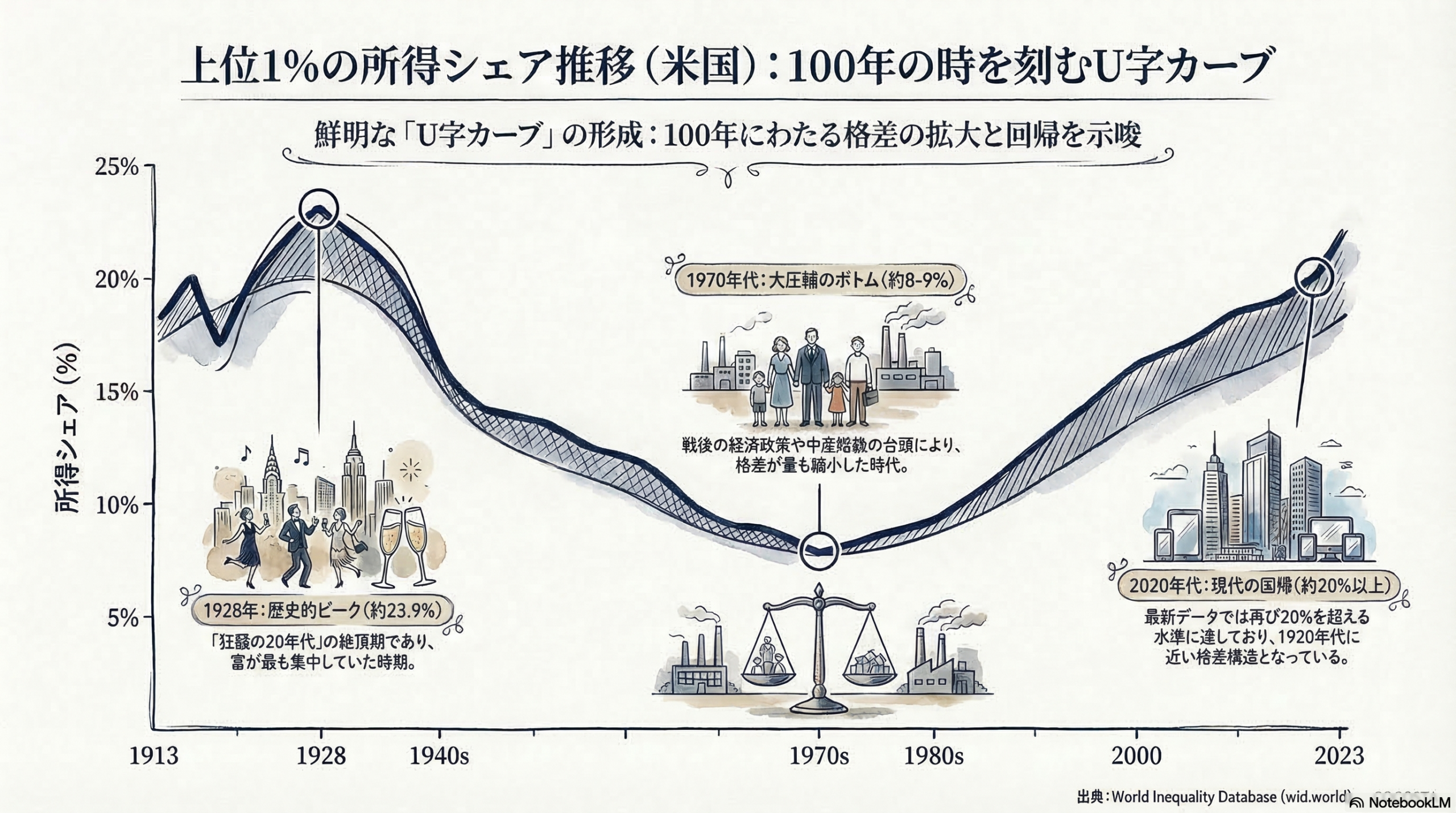 2020年代の現在、上位1%の所得シェアはふたたび約20%を超える水準です。100年かけてU字を描き、ほぼ元の位置にもどったのです。