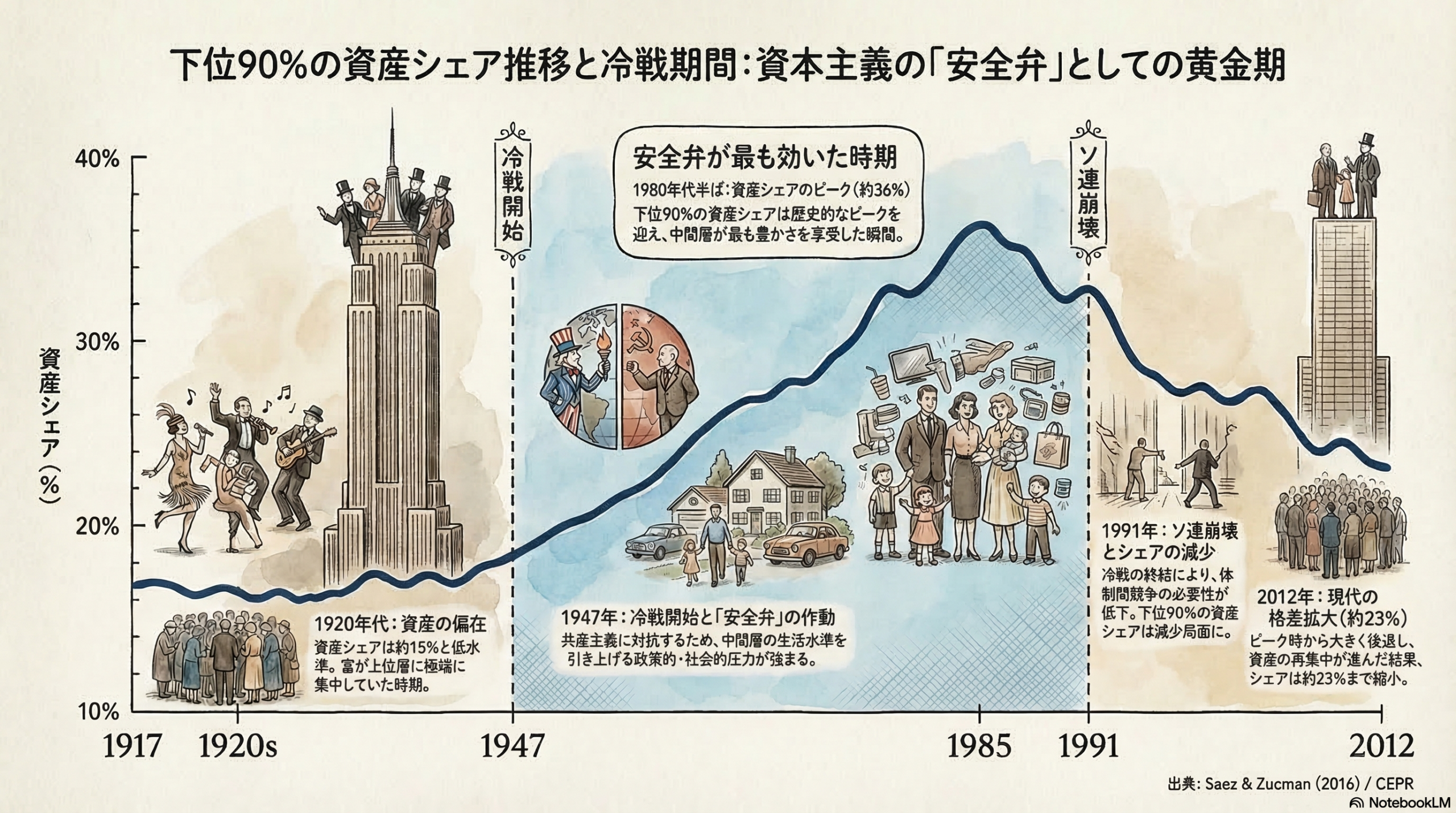 結論は明確でした。共産主義の広がりへの恐怖が、国内のエリートと労働者のあいだで所得を分け合う合意をうながしていた、と。