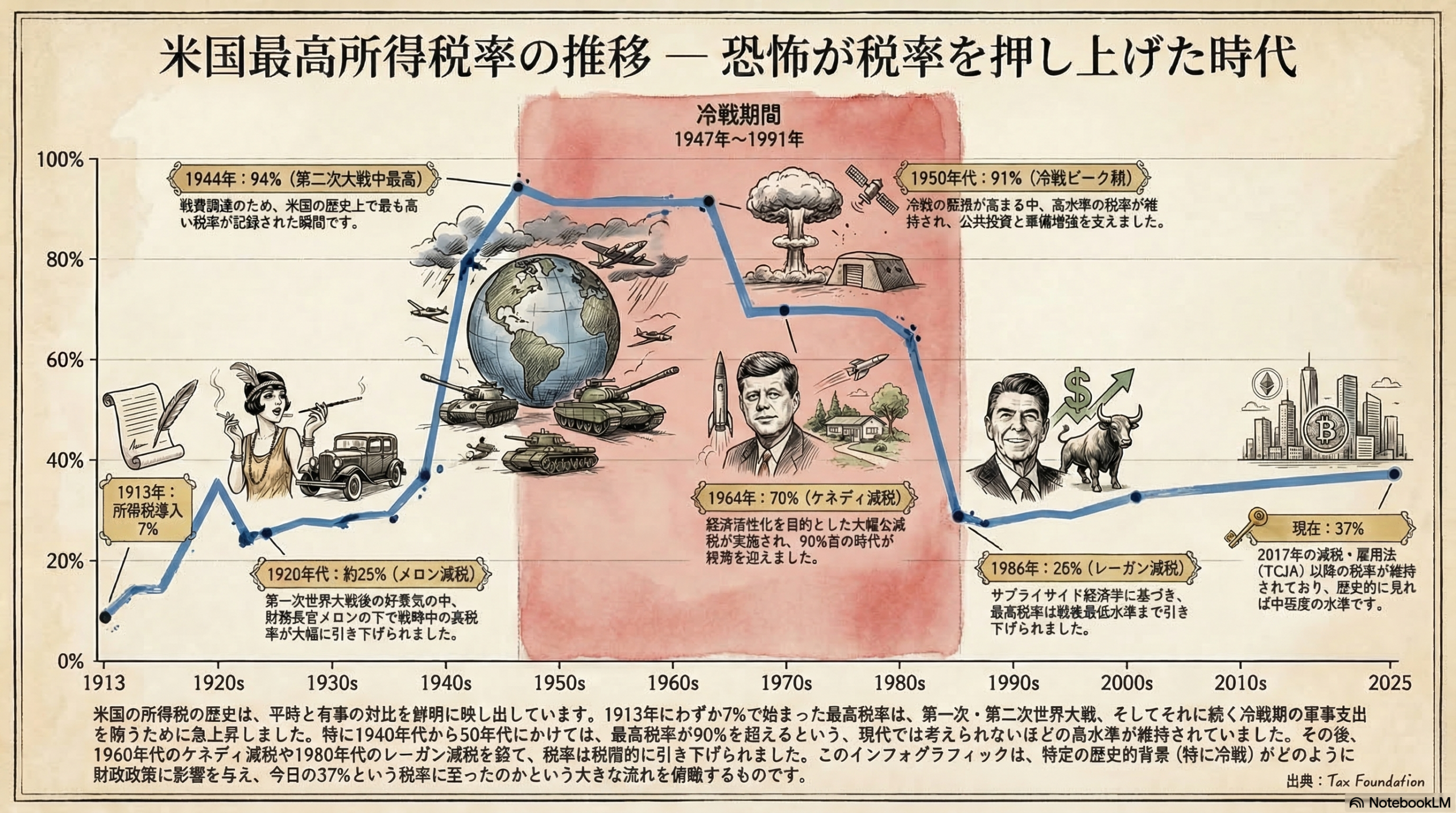 ところが第二次大戦中に94%まで急騰し、冷戦期を通じて91%という水準が続きました。