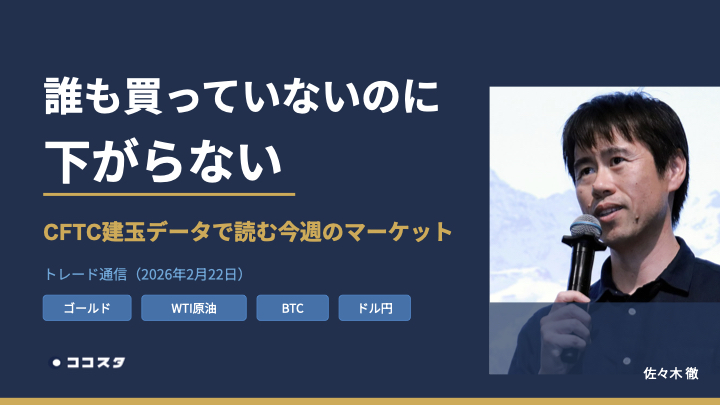 実戦トレーディングカレッジゴールドを拾うファンド、原油で踏まれるショート、BTCの諦めムード──今週のデータ全部見せます Posted on 2026-02-252026-02-25 by 佐々木徹(ささきとおる) 25 2月 ゴールドのCFTC建玉は底値圏なのに価格は下がらない。原油急騰の正体はショートスクイーズ。BTCのIV-HVスプレッドは底値シグナル。データが語る今週のマーケットを解説します。 続きを読む →